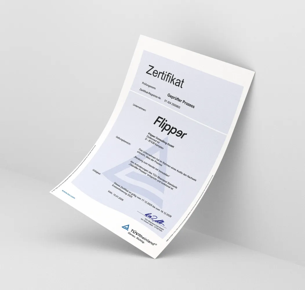 Die Flipper Consulting GmbH wurde im Rahmen eines Audits nach dem TÜV Rheinland Standard Geprüfter Prozess geprüft. Dabei wurde bestätigt, dass unser Prozess Beratung zum Handel mit Immobilien den Anforderungen entspricht und funktional ist.